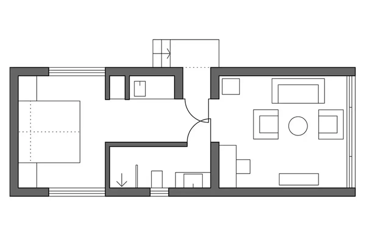 Die beiden Teichhäuser schweben zu einem Drittel über dem Teich. Innen ein Wohnraum mit Panoramafenster, eine Küchenzeile und ein Schlafbereich mit großem Dachfenster.