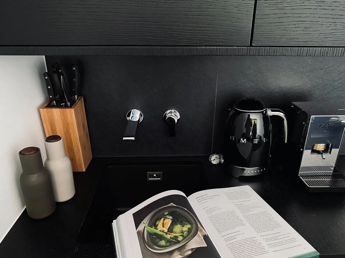 Höhe auf nichts, denn neben einer kleinen Kaffeeküche mit Sitzecke, gibt es einen TV, ein Bad mit Regendusche und ein